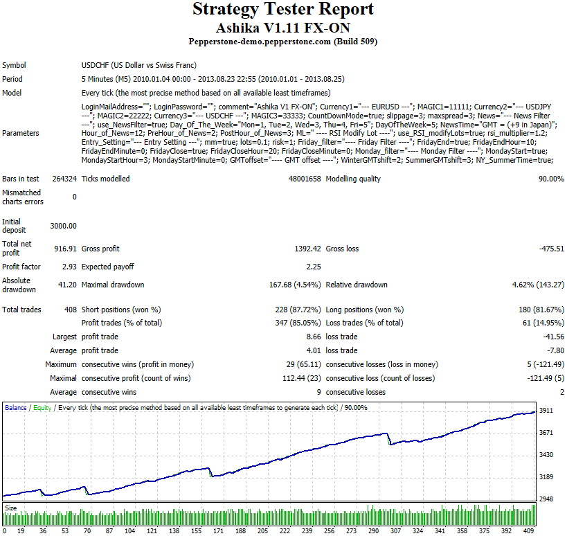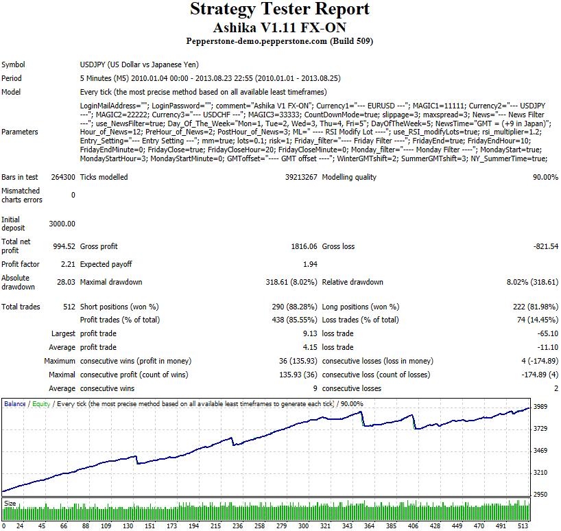 それぞれスプレッド2pips,初期口座残高3000ドルで実施してます.