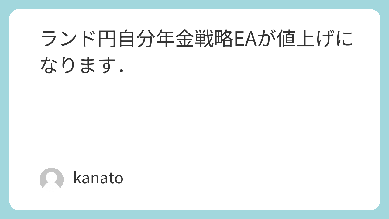 さて,本日は私も運用している超安定型EA『ランド円自分年金戦略EA』の値上げのご紹介です.