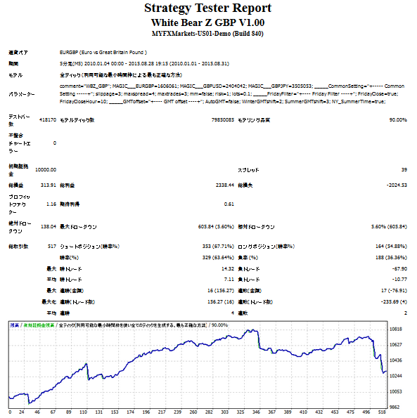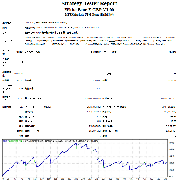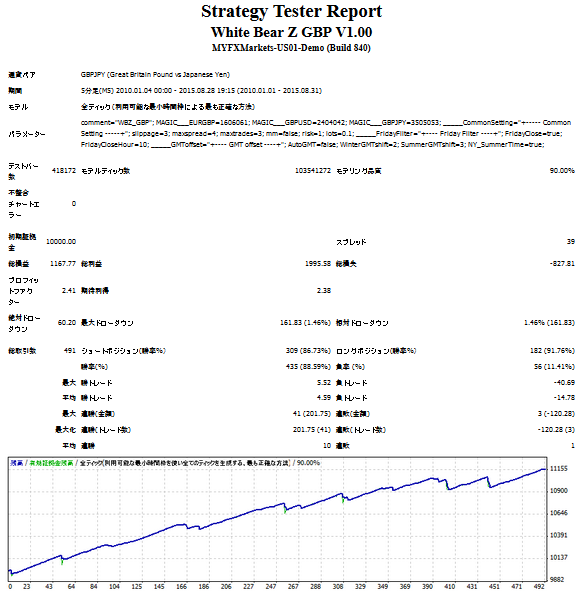 それぞれの通貨単位について,スプレッドをぎりぎりの3.9pipsに設定して2010年から2015年08月末までのバックテストしてみました.(通常スプレッドでのバックテストは販売ページを参照)