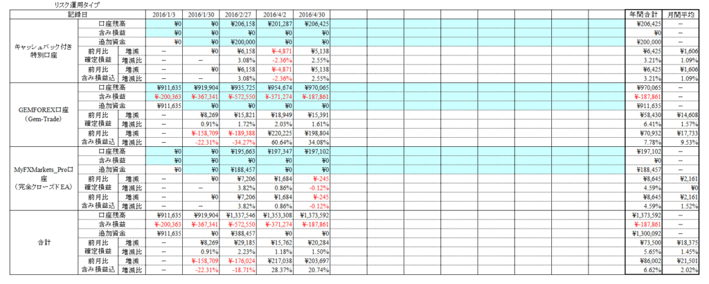 さて、今回は2016年04月度(2016年04月02日~04月30日)の運用結果をご報告します。
