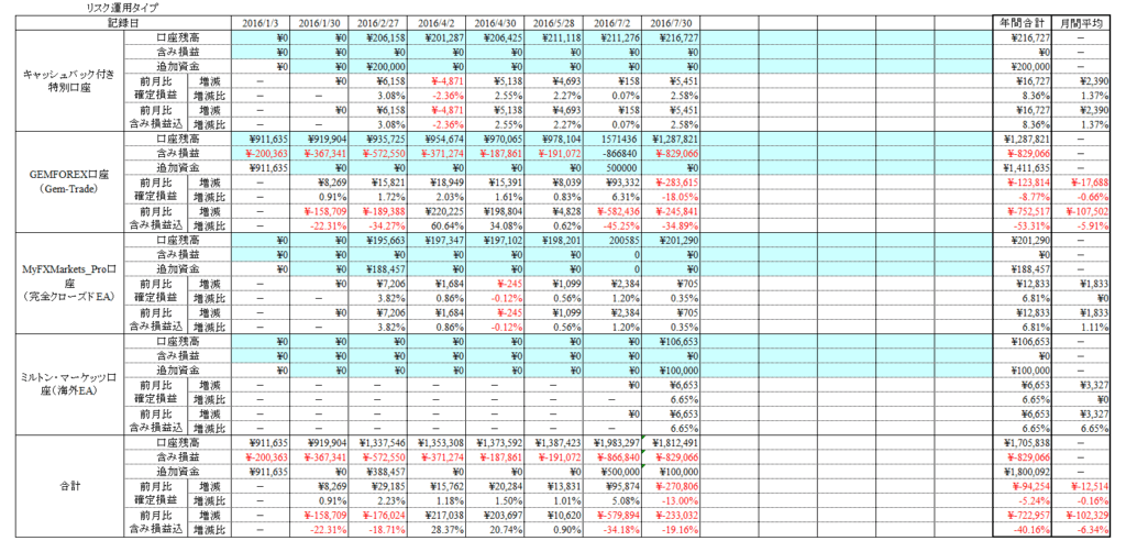 しかし、2016年07月度の利益率は-20%と完全にGEMFOREX口座のトレードが響いています。