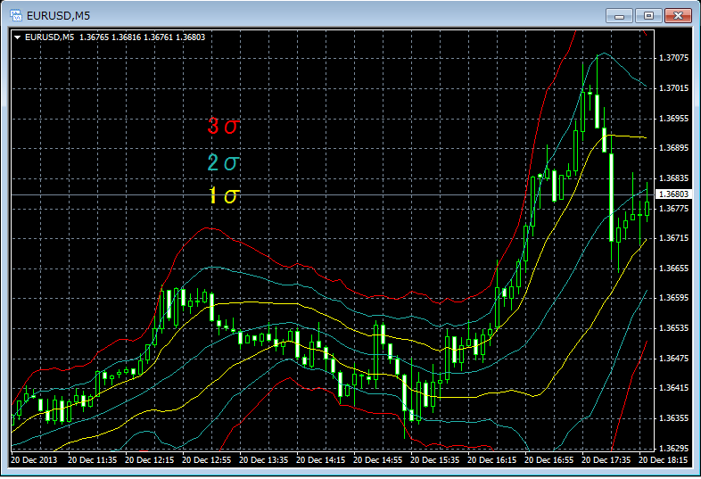 考え方としては,レートが移動平均線の±σに収まる確率が約68%,
