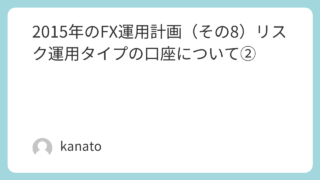 運用結果報告 2015年のFX運用計画(その8)リスク運用タイプの口座について② こんばんは,kanatoです.今日は家族で「ベイマックス」を見てきました.いやぁ~,一言「よかった」です.さて,本日も2015年のFX運用計画について書いてみたいと思います.リスク運用タイプの口座選定について,昨日までにめぼしいFX業者さん... 2014.12.30 運用結果報告