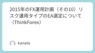 運用結果報告 2015年のFX運用計画(その10)リスク運用タイプのEA選定について(ThinkForex) こんばんは,kanatoです.年始から本業の方がいきなりトラブルで,このブログも前回から更新が空いてしまいました.来週からは本格的に運用を開始していきたいと考えているので,もう少しきちんと準備しないとなぉと反省しているところです.さて,今回... 2015.01.07 運用結果報告