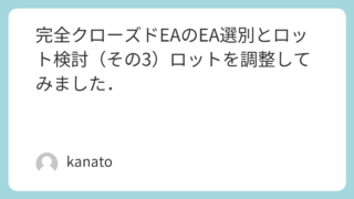 EA紹介 完全クローズドEAのEA選別とロット検討(その2) こんにちは,kanatoです.昨日は無事に娘からチョコもらえました.フルーツグラノーラ入りのサクサクのチョコでした.手作りだったのですが,結構おいしかったですさて,前回の続きで完全クローズドEAのロット検討について書いてみたいと思います.ま... 2015.02.15 EA紹介