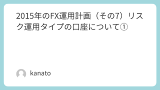 運用結果報告 2015年のFX運用計画(その7)リスク運用タイプの口座について① こんにちは,kanatoです.今日は数時間かけて実家に帰ってきました.娘も久しぶりにおじいちゃん,おばあちゃんに会えてうれしそうでした.さて,今回は市販のEAを使った運用の予定を書いてみたいと思います.Pepperstoneさんの日本撤退に... 2014.12.29 運用結果報告